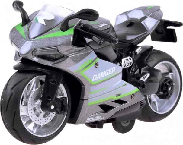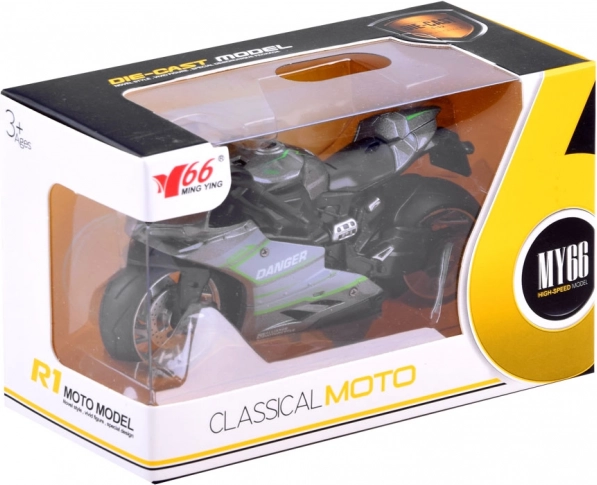 Metalmodel af motorcykel med pull-back drev, gummidæk og bagdæmper. Realistisk udførelse, robuste materialer og sjov kørsel for børn fra 3+.