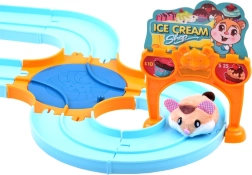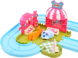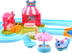 Dette interaktive sæt kombinerer en isbod med en farverig bane, hvor hamsteren bevæger sig selvstændigt og skifter retning takket være sporskifteren. Børn kan bruge deres figurer, sætte dem i stolene og lege café og betjening. Hamsteren kan trække den medfølgende vogn og levere desserter på en plan, glat overflade.