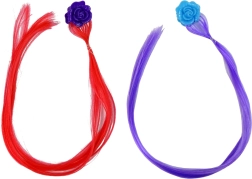 Sættet indeholder to syntetiske totter med blomsterspænder – én rød med en lilla rose og én lilla med en blå rose.