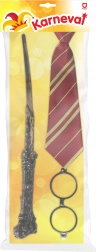Gør dig klar til et magisk eventyr med et komplet tryllesæt. Med den lette plastikstav, stilfulde briller og et iøjnefaldende slips skaber du et autentisk look på ingen tid. Ideelt til både børn og voksne, der vil fuldende deres kostume nemt og effektfuldt.