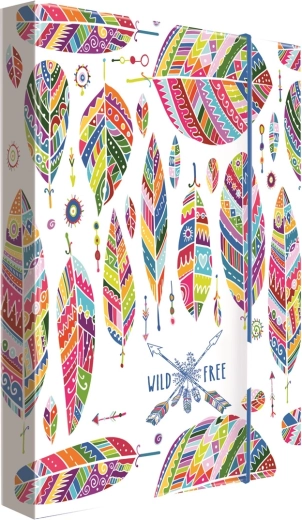 Stilfuld og praktisk boks til hæfter i A4 Jumbo-format med motivet Fjer. Ideel til skoleelever og studerende til opbevaring af hæfter, papirer og tilbehør. Takket være den laminerede overflade er den modstandsdygtig over for skader, holder orden og beskytter indholdet. Praktisk elastiklukning og rygbredde på 4 cm for god plads.