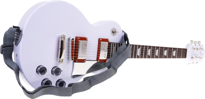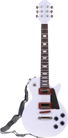 - Pakkens indhold: hvid elektrisk guitar, høretelefonsæt med mikrofon, rem
