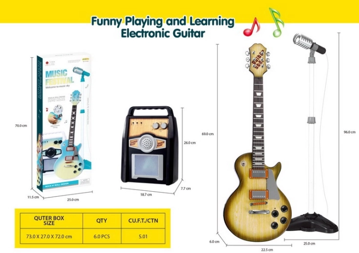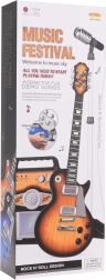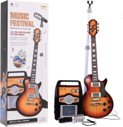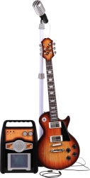 Dette kreative musiksæt er et ideelt valg til børn fra 3 år. Den elektriske guitar i brun udførelse ligner et rigtigt instrument, du tilslutter den til forstærkeren med det medfølgende kabel, og barnet kan straks begynde at spille og synge i mikrofonen på det stabile stativ. Forstærkeren giver mulighed for separat regulering af lydstyrken for guitar og mikrofon og har indgange til guitar, mikrofon samt ekstern MP3. Farvede lys, der blinker i takt, sørger for stemningen.