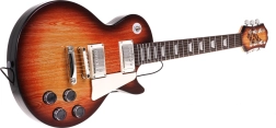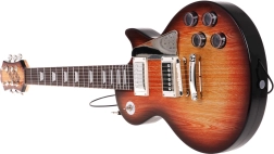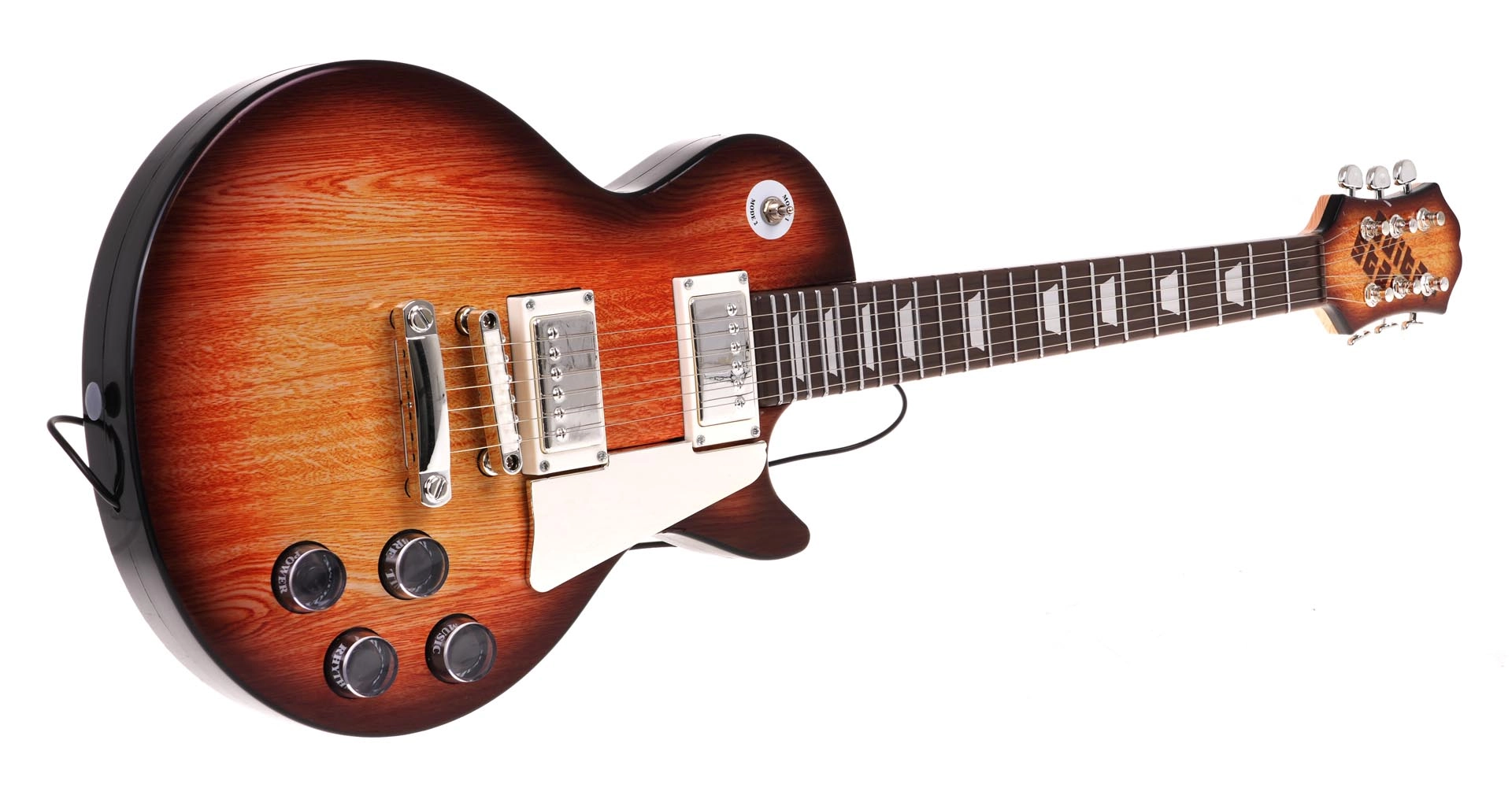 Guitaren i brun “sunburst”-stil med betjeningsknapper og rem motiverer børn til at spille musik. Forudindstillede rytmer og melodier hjælper med de første skridt.