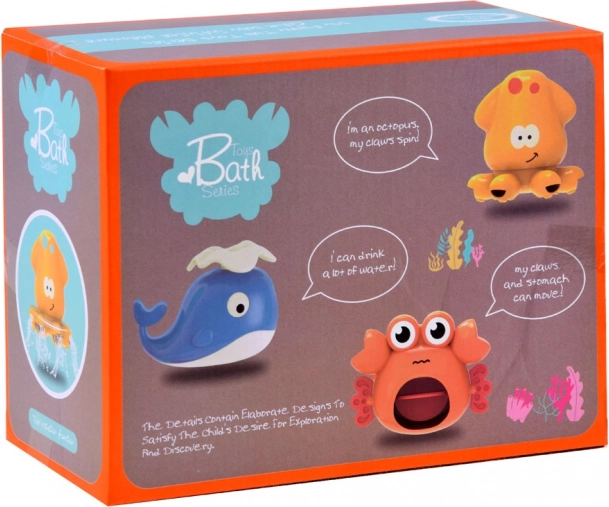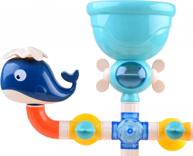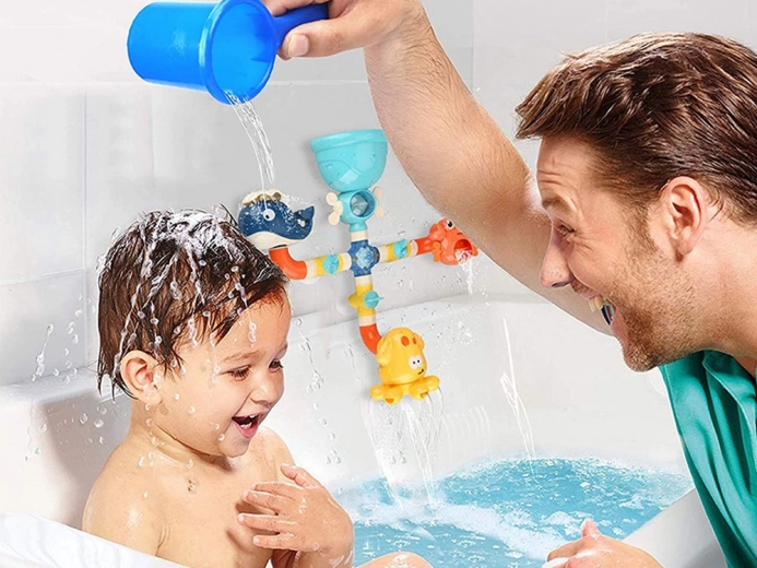 Dette interaktive vandset forvandler hvert bad til leg. Hæld vand i den øverste tragt og følg, hvordan strømmen løber gennem rørene, sætter elementerne i gang og skaber springvand og vandfald. Delene med motiver af blæksprutte, hval og krabbe kan nemt omarrangeres for at lave nye ruter.