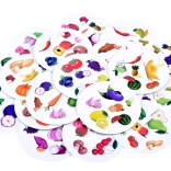 Fangende billeder af gulerødder, ærter, citroner og druer fastholder opmærksomheden og lærer genkendelse af former og farver.