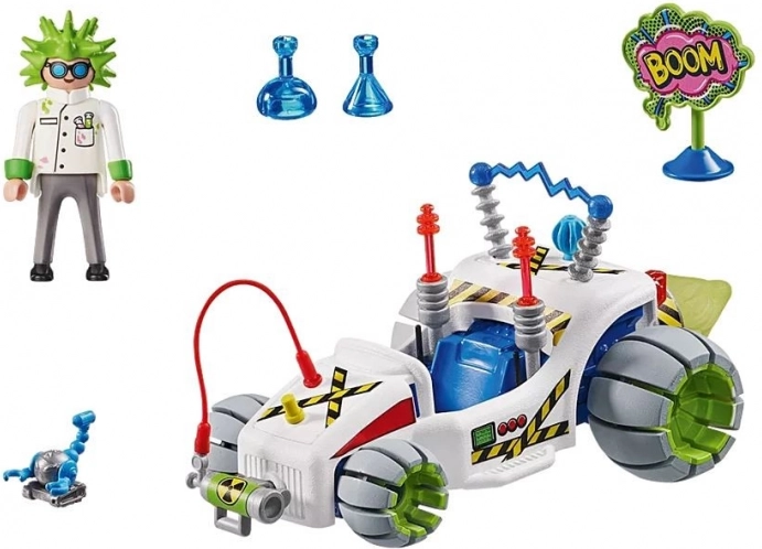 Tag til start med den skøre professor og hans videnskabelige gokart! Takket være den optrækkelige (pull-back) motor suser køretøjet frem, mens reagensglas, “jet”-drift og elektrisk udstyr giver hvert løb en god portion fantasi. Den futuristiske karrosseri kan pyntes med forskellige accessories for at skabe en unik racermaskine.