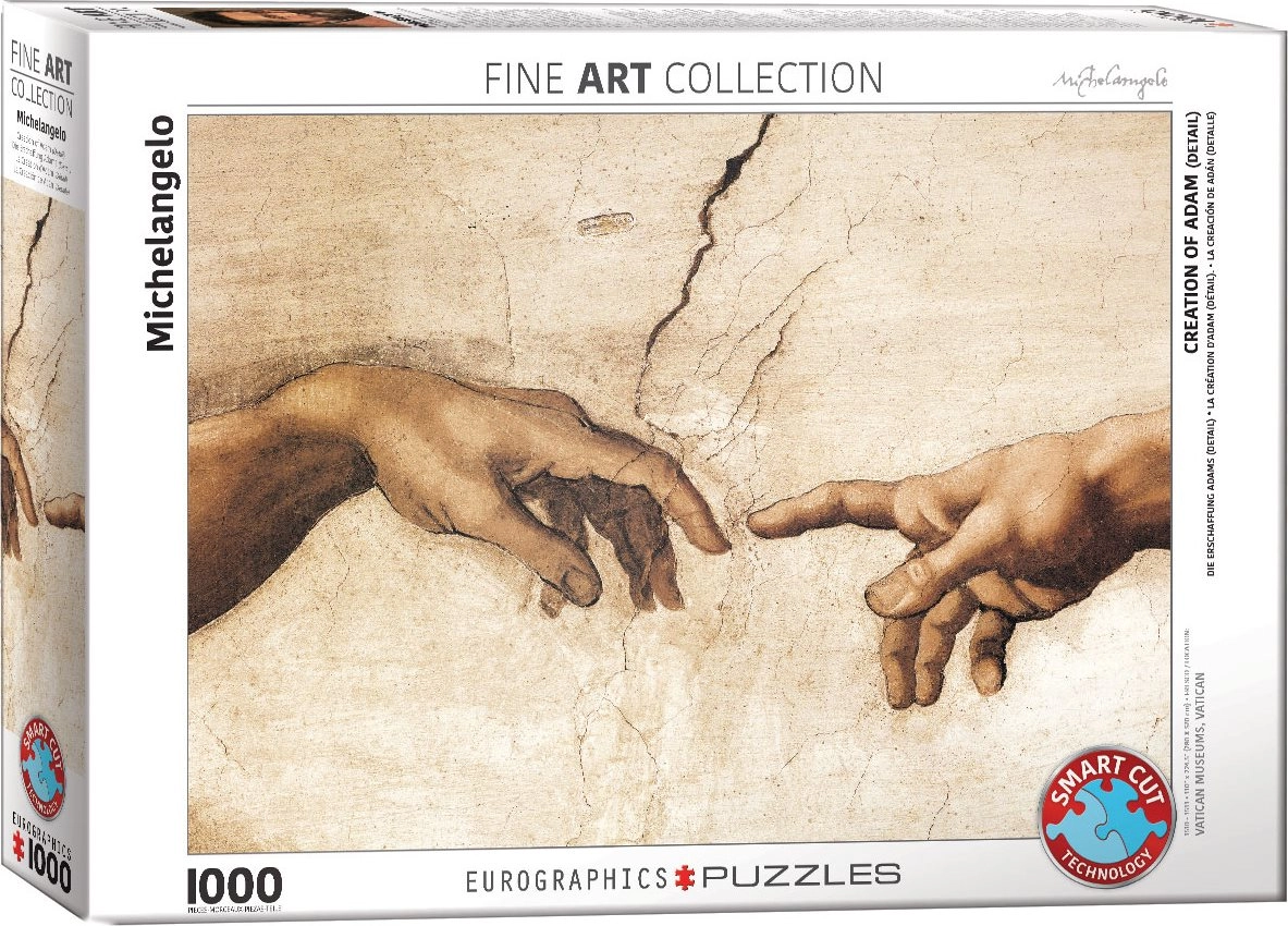 Nyd en kunstnerisk oplevelse med puslespillet “Skabelsen af Adam – billeddetalje” med 1000 brikker. Takket være de usædvanligt formede brikker fra EUROGRAPHICS byder dette puslespil på højere sværhedsgrad, præcis gengivelse af detaljerne i det berømte værk og et færdigt mål på ca. 67,63 × 48,89 cm.