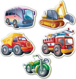 Dette sæt indeholder fem progressive puslespil med motiver af populære køretøjer – fra bus til brandbil. Takket være den gradvist øgede sværhedsgrad (3, 4 og 5 brikker) træner børn naturligt logisk tænkning og tålmodighed. Glade farver og venlige illustrationer fastholder deres opmærksomhed og styrker glæden ved at opdage.