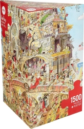 Oplev en original puslespilsoplevelse med HEYE “Himmel og helvede” med 1500 brikker i en utraditionel trekantet æske. Der medfølger også en plakat som forlæg, der gør det nemmere at lægge og øger oplevelsen. Illustration af Hugo Prades, en anerkendt spansk grafiker og karikaturtegner. Puslespillet byder på tryk i høj kvalitet, præcist udstansede brikker og færdigt mål ca. 58 × 82 cm.