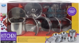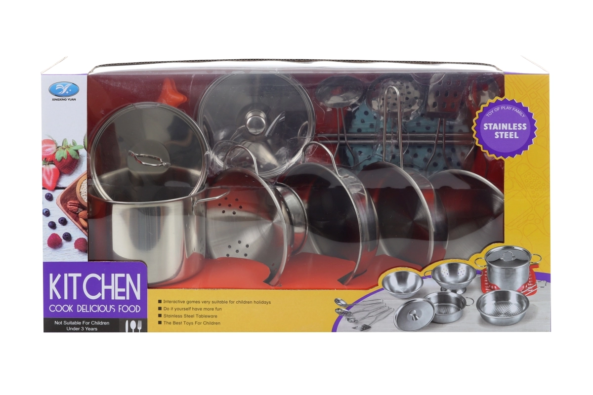 Sættet i rustfrit stål indeholder gryde, dørslag, pande, skål, lav gryde, 2 låg, suppeske, palet, lille hånddørslag og pastaske. Pakket i kasse. Pakkestørrelse ca. 38x20x10 cm. Alder 3+