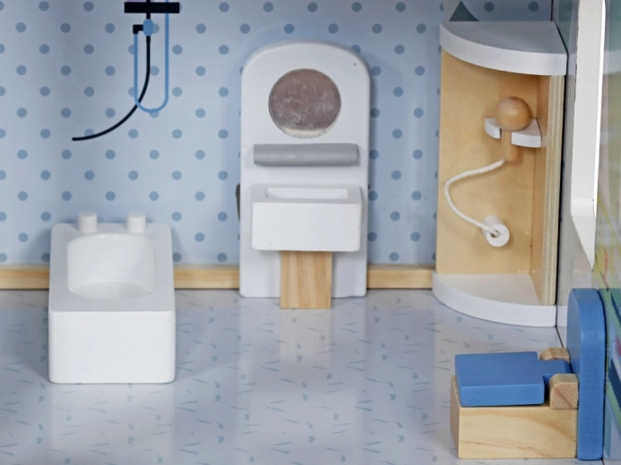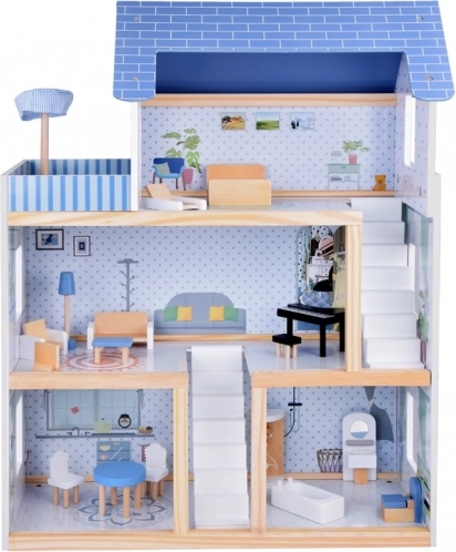 Blåt trædukkehus + møbler 3 etager ZA5273