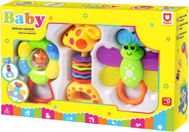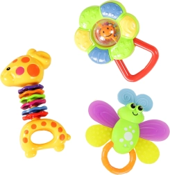 Med dette sæt af glade rangler sørger du for uendelige timers underholdning for din baby. Hver rangle er omhyggeligt designet med fokus på børns sikkerhed og komfort. Med deres klare farver og spændende former stimulerer de barnets sanser, støtter udviklingen af hånd-øje-koordination og øger nysgerrigheden.