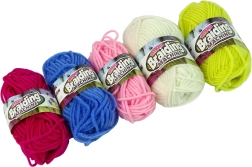 .- 5 farver moulinégarn: hvid, gul, mørkerosa, lyserosa, blå