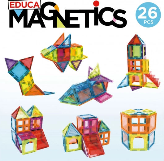 Forestil dig – byg – lær! Kreativt magnetisk byggesæt Magnetics fra den spanske producent EDUCA gør det muligt at samle et stort antal tredimensionelle objekter ved hjælp af todimensionelle plastikmangekanter.