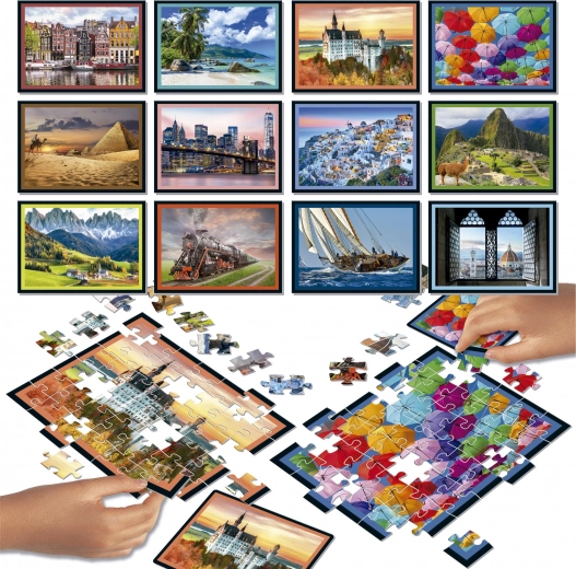 Pakken indeholder 12 puslespil (42 brikker hver) og 12 forlæg, så I nemt kan arrangere turneringer og sammenligne tider. Et fremragende gaveidé til puslespilsentusiaster og hyggelige familieaftener.