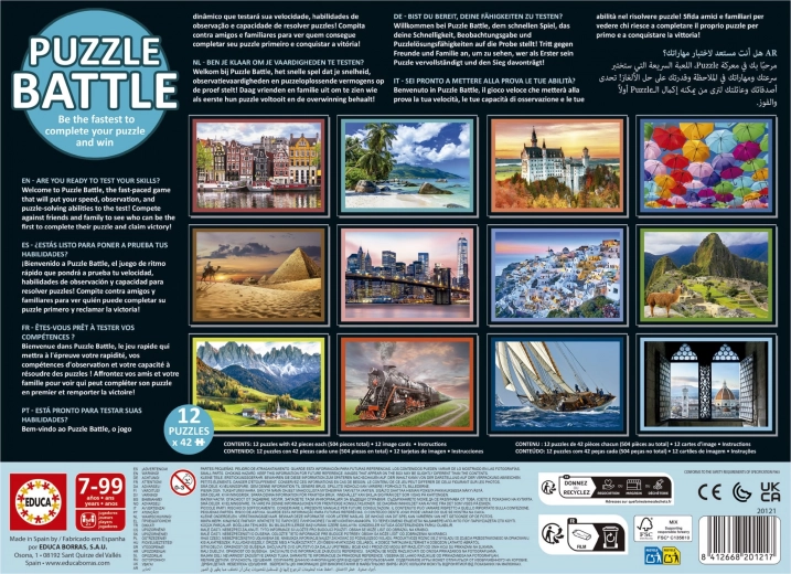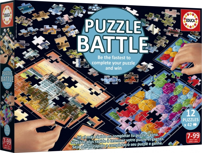 Nyd en spændende puslespilskamp med EDUCA-sættet, der kombinerer klassisk underholdning med fokus på hastighed, konkurrence og udvikling af færdigheder. I pakken finder du 12 separate puslespil med 42 brikker og 12 forlægskort – ideelt til leg med venner og familie. Hvert færdigt puslespil måler ca. 17 × 12,3 cm.