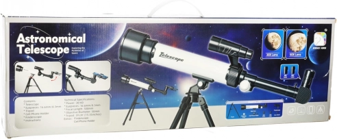 - Teleskop, stativ, søger, 2 okularer (30x, 60x), telefonholder, pudseklud