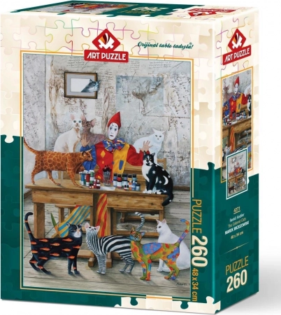 Oplev glæden ved at lægge puslespil med ART PUZZLE og motivet af farverige katte. Sættet med 260 brikker giver en behagelig udfordring og afslapning og danner efter samling et billede på 34 × 48 cm.