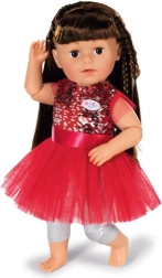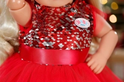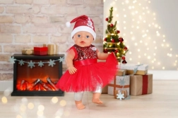 BABY born kan godt lide at klæde sig festligt på til jul. Og hvad kunne være smukkere end en rød kjole med pailletter og tylskørt, sølvfarvede leggings og en nissehue, der varmer om ørerne?
