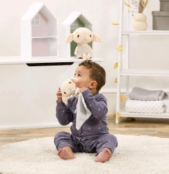 Nussekluden Dobby er en blid, krammevenlig makker inspireret af Harry Potter-universet. Det grå tæppe med tekst og stjerner fanger opmærksomheden med det samme, mens den superbløde krop med store ører og kvalitetsstikninger sørger for tryg og behagelig hygge for enhver baby.