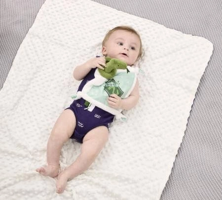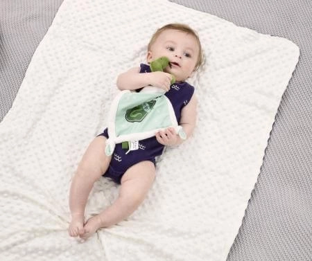 Knudede hjørner, bløde labels og broderede detaljer understøtter naturlig udforskning og udvikling af finmotorik.