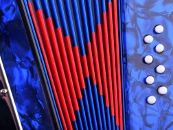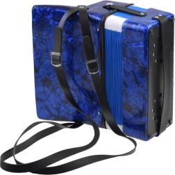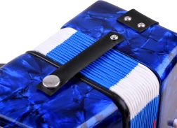 Skinnende blåt kabinet med marmoreffekt, tangenter og bas-knapper. Harmonikaen lyder klart og behageligt – ideel til de første musikalske oplevelser.