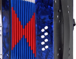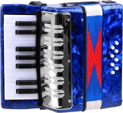 Realistisk udseende og funktion – en børneharmonika, der ligner og fungerer som et rigtigt instrument: lyden skabes ved at trække og presse bælgen, og der er både tangenter og bas-knapper. Takket være den solide udførelse og den glansfulde blå overflade er den både attraktiv og holdbar.