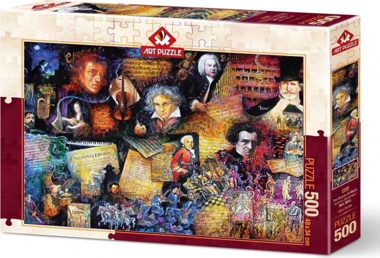 Puslespil med motiv af vigtige komponister byder ikke kun på god underholdning, men også et interessant blik på musikkens største navne. Når du har samlet alle 500 brikker, skaber du et billede på cirka 48 x 34 cm.