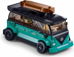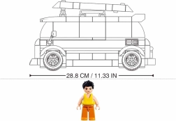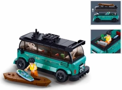 Byggesættet tilbyder en detaljeret model af en surfervogn med realistiske træk som vinduer, hjul og tagbagagebærer.