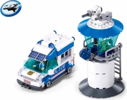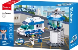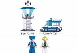 Byggesættet indeholder 245 præcise dele, der kan samles til et realistisk politimiljø med bil og tårn.