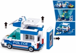 Denne politibil er bygget af sammenkoblelige plastklodser og indeholder funktionelle elementer som satellitantenne og bevægelige døre.