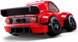 Byggesættet indeholder en detaljeret racerbil med fartprægede elementer som bagspoiler og kraftige dæk.