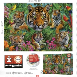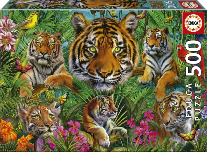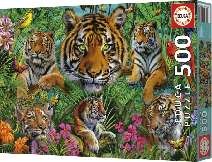 Nyd afslapning og udfordring med et kvalitets‑puslespil fra EDUCA, der viser majestætiske tigre i en frodig jungle. 500 brikker er et ideelt antal til hyggelig lægning og giver et smukt færdigt billede på ca. 48 × 34 cm. I æsken finder du FIX PUZZLE lim gratis til nem fiksering og udstilling af det færdige værk.