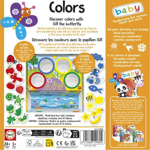 Det pædagogiske sæt Educa Baby med sommerfuglen Greta er et ideelt redskab til den første farvegenkendelse. Børnene placerer farvede elementer i de rigtige åbninger i æsken og udvikler dermed naturligt øje–hånd-koordination, finmotorik og koncentration. De store og holdbare brikker er tilpasset små hænder.