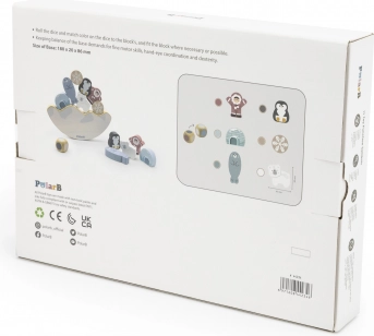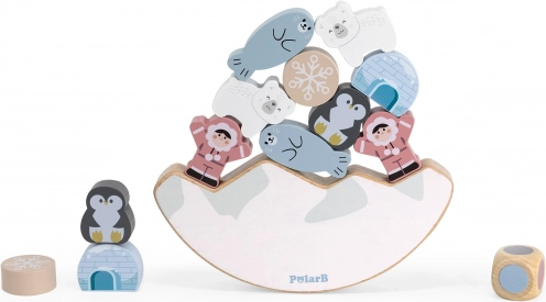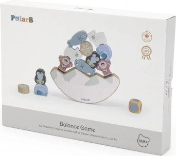 Træ-balancespil PolarB Arktiske dyr er beregnet til børn fra 18 måneder og har til formål at udvikle finmotorikken. Indeholder 12 klodser, en balancebase og en terning til interaktiv leg.