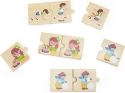 Dette træpuslespil fra VIGA giver barnet mulighed for at samle 8 farverige puslesæt, som illustrerer forskellige børns aktiviteter i deres dagligdag. Det omfatter populære aktiviteter som håndvask, løb eller at puste lysene ud på en kage.