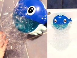Denne magiske badelegetøjs-hval laver rige skumbobler ledsaget af melodier, der glæder enhver lille badegæst. Du tænder hvalen med ON/OFF-knappen i øjet, og på et øjeblik bliver badet til et sjovt show.