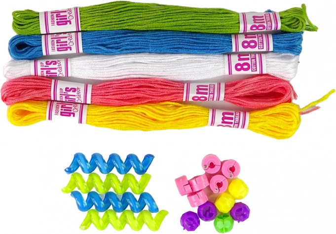 - 2 stylingværktøjer, 5 bomuldstråde (hver 8 m), farvede perler, kam, vejledning