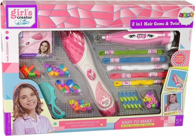 Dette komplette hårpyntesæt lader børn udtrykke deres fantasi. Med to værktøjer til påføring af perler og til at twiste tråde kan du nemt skabe originale frisurer – fra fine fletninger med farvede tråde til markante mønstre med perler.