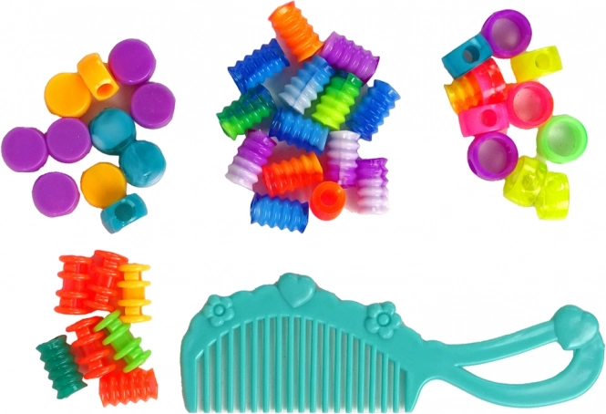 I æsken finder du et bredt udvalg af perler i nuancer af lyserød, gul, lilla, grøn, blå og orange samt fem bomuldstråde (grøn, blå, hvid, lyserød, gul), hver på 8 m. Der medfølger også en praktisk blå kam og en detaljeret trin-for-trin-stylingvejledning.