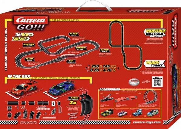 Bilbane CARRERA GO Ferrari Power Racing 8,6 m med 2 FERRARI 296 GT3, Turbo-controllere og rigt tilbehør. Nem montering, fremragende vejgreb, fra 6 år.