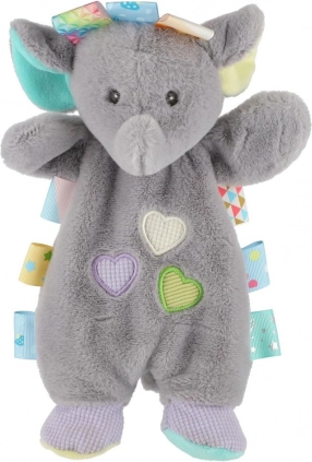 Denne bløde krammebamse i elefantform kombinerer komfort og stimulerende leg. Den ultrabløde plyds, pastelfarvede detaljer og de mange farvede mærkelapper langs kanten indbyder til at gribe og mærke på, hvilket understøtter finmotorik og sensorisk udvikling fra første dag.