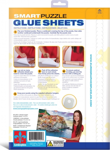 Vil du gerne udstille dit yndlingspuslespil? Sættet EUROGRAPHICS Smart Puzzle Glue Sheets tilbyder en enkel og ren løsning. De selvklæbende folier holder brikkerne sikkert sammen, og to kroge gør det nemt at hænge det på væggen.