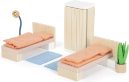 Det miniature soveværelse til dukkehuset fra mærket Small Foot bringer magien af rigtige møbler ind i børnenes verden. Dette elegante møbelsæt inkluderer en dobbeltseng, som nemt kan opdeles i to separate senge, hvilket giver fleksibilitet for forskellige legeformer. Yderligere inkluderet er to puder, to dyner, en garderobeskab med spejl, en lampe og to tæpper, der fuldender ægtheden af dette miniature soveværelse.