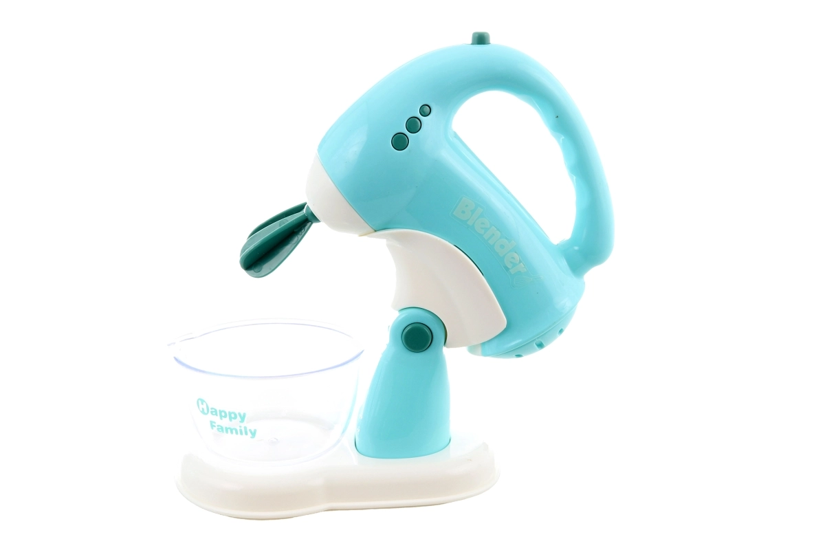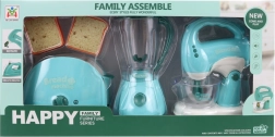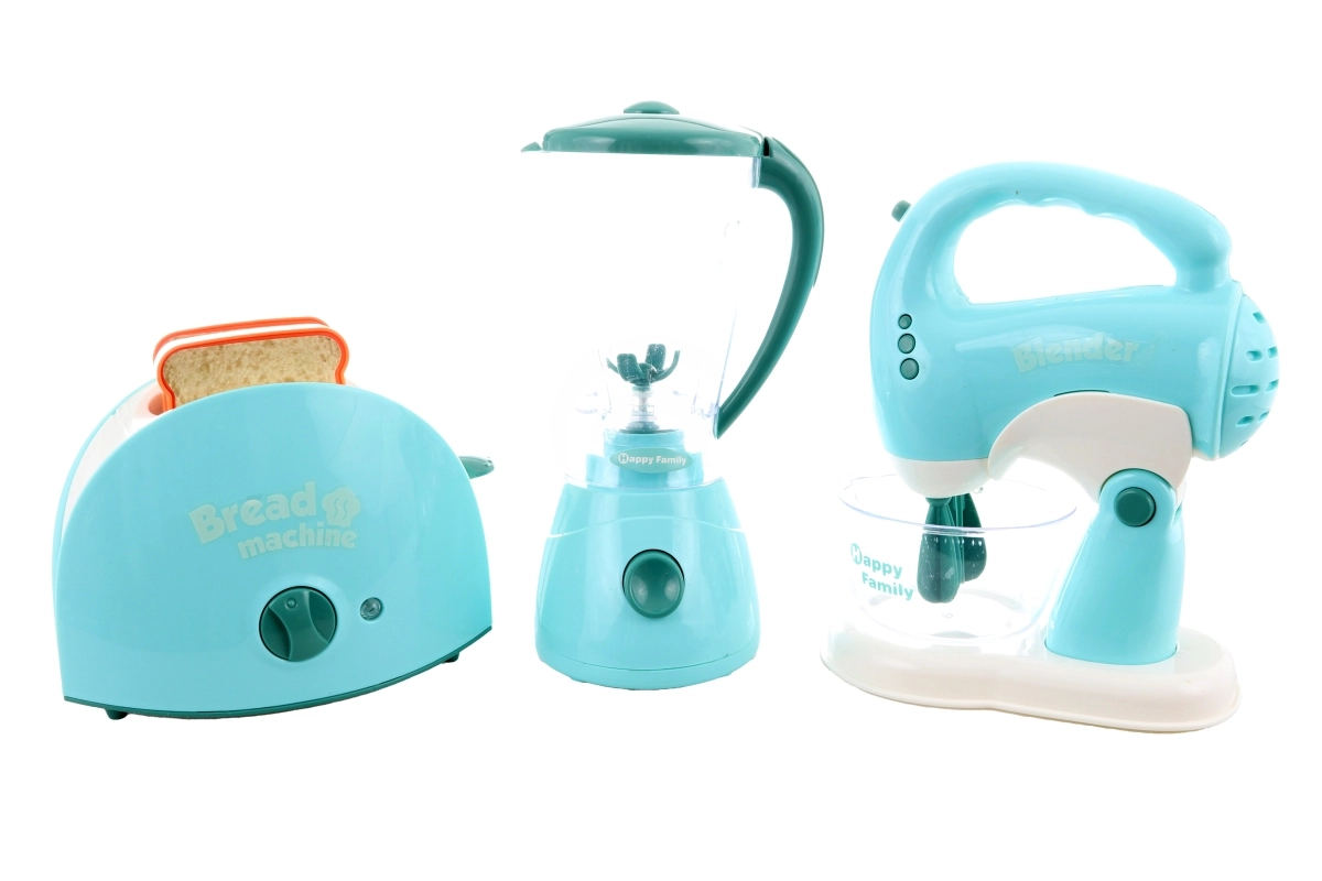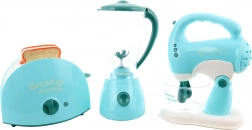 Dette sæt køkkenapparater indeholder en brødrister, en blender og en pisker. Hvert apparat drives af 2 AA-batterier, som ikke medfølger. Når batterierne indsættes, lyser brødristeren og afgiver lyde, blenderen roterer og afgiver lyde, og piskeren lyser, afgiver lyde, og piskerisene roterer. Materiale: plast. Pakket i æske. Pakkemål ca. 43×22×9,5 cm. Alder 3+.