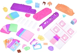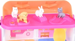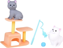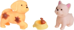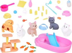 Pakken indeholder 2 hunde, 2 katte og en kanin af blød gummi samt møbler og udstyr til pleje, leg og afslapning.