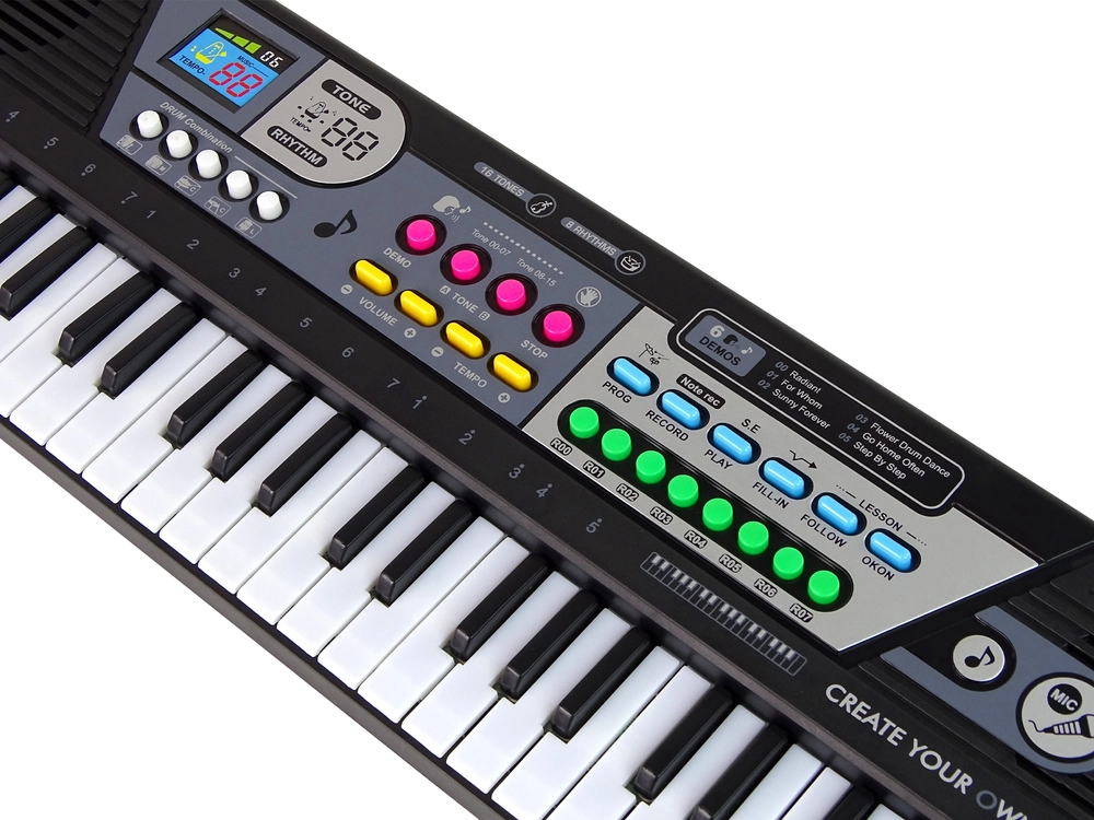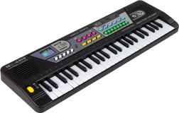 Dette keyboard har hele 49 tangenter, hvilket gør det let og naturligt at spille. Den indbyggede mikrofon giver mulighed for at synge yndlingssange, hvilket helt sikkert vil tiltale børn, der vil eksperimentere med vokaler. Knapperne er nemme at betjene, og takket være det ergonomiske design er produktet meget behageligt at bruge. Den lette konstruktion gør det nemt at bære legetøjet og placere det på et bord eller skrivebord, så dit barn kan optræde i ethvert hjørne af hjemmet. En ekstern indgangsstik giver mulighed for at lytte til yndlingssange.