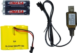 I pakken finder du bil, fjernbetjening, genopladeligt batteri 4,8 V 700 mAh, 2× AA-batterier og USB-oplader – tænd og kør med det samme.