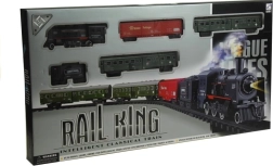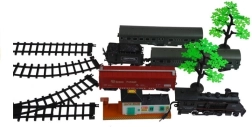 Sættet indeholder lokomotiv, godsvogn, tre mindre vogne, station, to træer, skinner og en vanddoser til røg-effekten. Isæt blot 4 AA-batterier (medfølger ikke) i godsvognen, forbind med lokomotivet, og efter en kort opvarmning af varmelegemet er I klar til afgang.